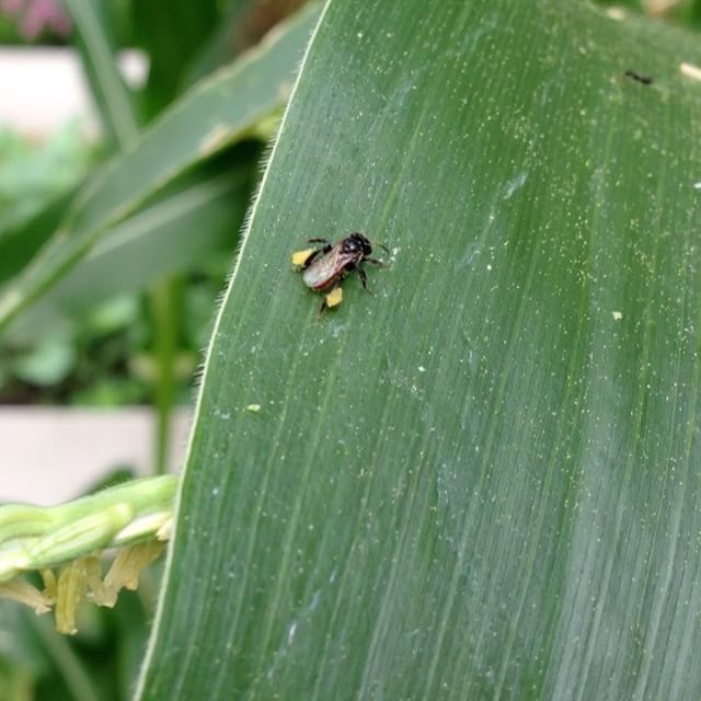 Checking out thunder thighs here, buzzing about our batch of #corn at #eatsshootsandroots. Can anyone identify this species of #stinglessbee / #kelulut?