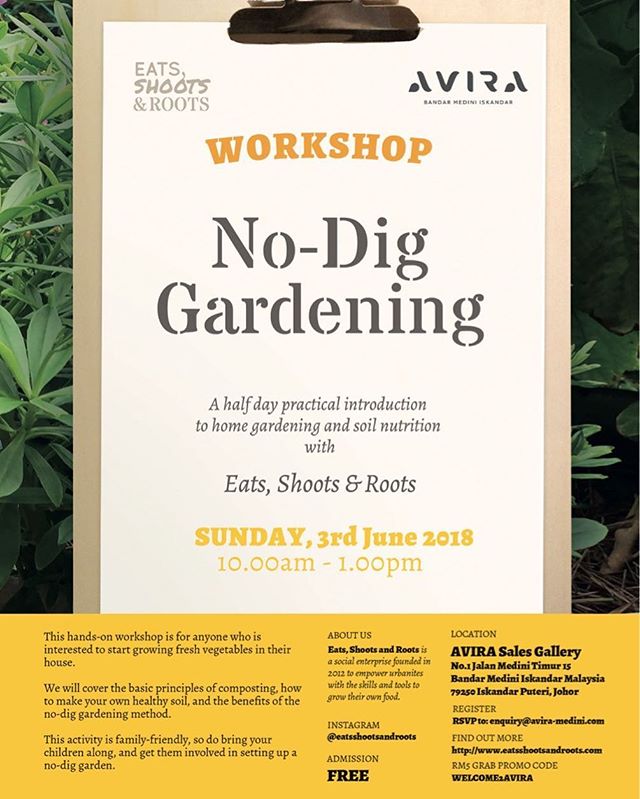 Friends in Johor: In collaboration with Avira Medini, we will be conducting our No-Dig Gardening workshop at Avira, just opposite Sunway Citrine in Iskandar @ Sunday, 10am – 1pm. Come through and learn the basics of setting up your own edible garden at home. There's even a Grab coupon code to get RM5 off your ride here: welcome2avira #nodiggardening #eatsshootsandroots #johor #johorbahru