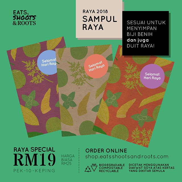 "Makan sudah,Bersalam pun sudah,Duit Raya takkan dah lupa." 🏼-Setiap tahun untuk Hari Raya, kita bermohon maaf antara satu sama lain dan enjoy dengan ahli keluarga kita bila balik kampung. Selain daripada makanan Raya yang best, ada jugak benda lain yang dapat our attention (especially adik-adik kita yang muda)...Duit Raya!-Sampul Raya kita sesuai bukan saja untuk digunakan sebagai paket duit raya, boleh jugak guna untuk simpan biji benih. Kiranya macam 2-in-1 lah kan  lagi-lagi kita cetak menggunakan dakwat soya atas kertas yang dikitar semula: lebih eco-friendly daripada sampul raya yang sudah biasa digunakan -Order online @ www.shop.eatsshootsandroots.org ataupun DM untuk more info #eatsshootsandroots #raya #garden #green #sayur #seeds #sampulraya
