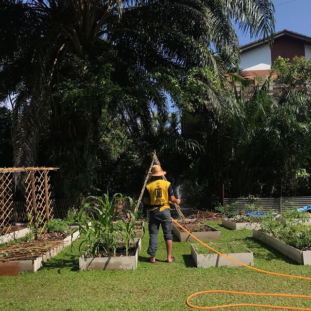 Our main garden guy, @naqibiskandar watering the beds for the last time! #preirrigationdays #irrigation #gardenhosenomore #eatsshootsandroots #sayurinthecity